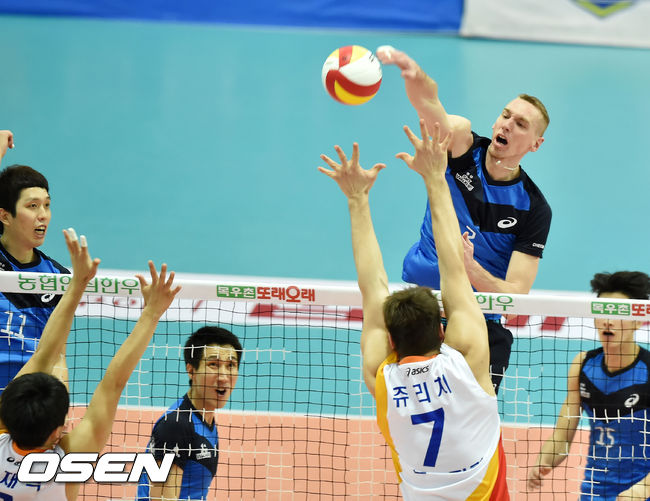 2일 오후 수원실내체육관에서 2014-2015 NH농협 V-리그 남자부 한국전력과 현대캐피탈의 경기가 열렸다. 1세트 현대캐피탈 케빈이 강타를 날리고 있다.