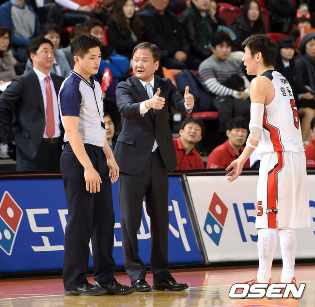 2쿼터 모비스 유재학 감독이 심판 판정에 어필하고 있다.
