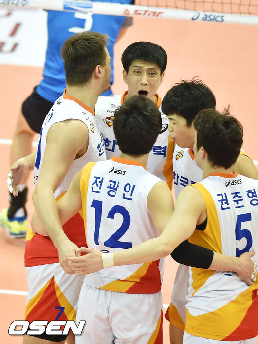 2일 오후 수원실내체육관에서 2014-2015 NH농협 V-리그 남자부 한국전력과 현대캐피탈의 경기가 열렸다. 1세트 한국전력 하경민이 공격에 성공한 후 기뻐하고 있다.