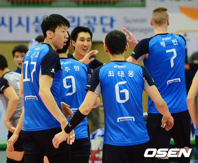 2일 오후 수원실내체육관에서 2014-2015 NH농협 V-리그 남자부 한국전력과 현대캐피탈의 경기가 열렸다. 1세트에 이어 2세트를 따낸 현대캐피탈 선수들이 기뻐하고 있다.