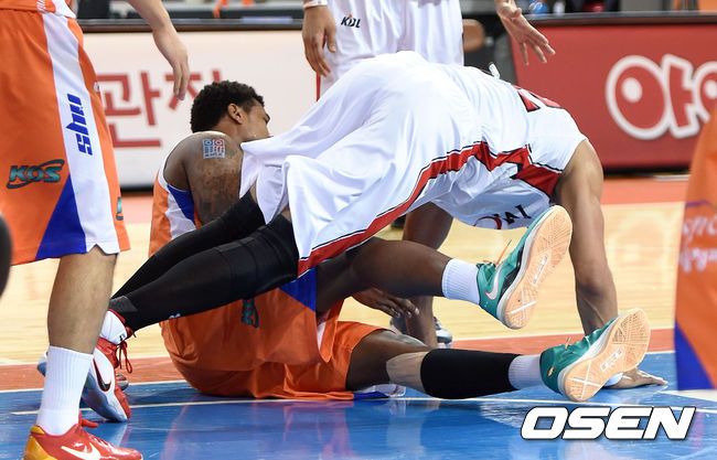 3쿼터 전자랜드 포웰과 모비스 클라크가 충돌하고 있다.