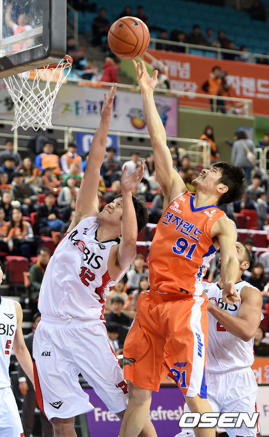 3쿼터 모비스 함지훈과 전자랜드 박진수가 리바운드 다툼을 하고 있다.