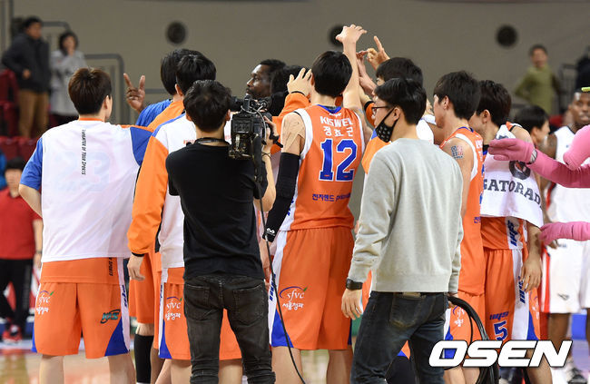 경기 종료 후 전자랜드 선수들이 파이팅을 외치고 있다. /sunday@osen.co.kr