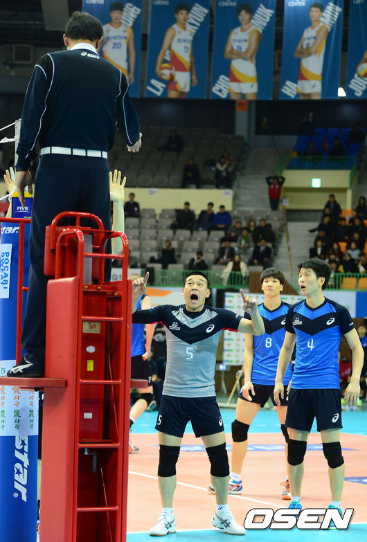 2일 오후 수원실내체육관에서 2014-2015 NH농협 V-리그 남자부 한국전력과 현대캐피탈의 경기가 열렸다. 4세트 현대캐피탈 여오현이 주심에게 강하게 항의하고 있다.