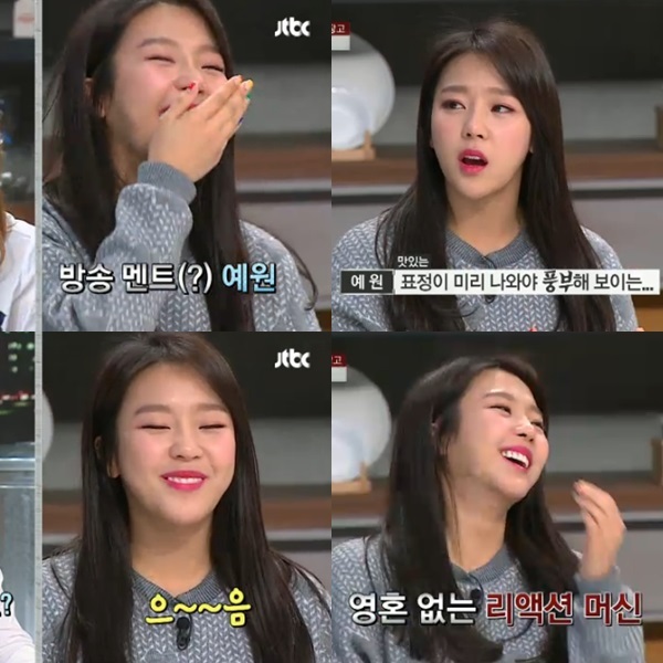 가수 예원은 자칭타칭 ‘리액션 머신’이었다. 어떤 질문을 해도 조금의 생각도 하지 않고 1초 만에 방송용 멘트를 내뱉는가 하면 예능 리액션의 모범답안을 선보이는 등 ‘로봇연기의 달인’ 장수원에 대적할 만한 영혼 없는 ‘로봇 리액션의 달인’이었다.