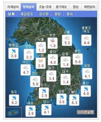 오전 최저기온은 영하 3~5도로 전날보다는 높겠다. 오후 최고기온은 영상 4~11도로 전날보다 춥겠다.