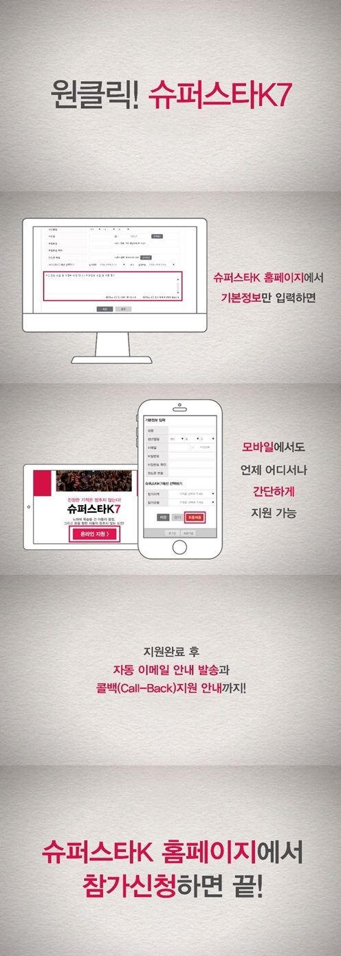 포털사이트에서는 ‘슈퍼스타K’를 검색하는 것만으로, 카카오톡에서는 CJ E&M 플러스친구(플친)와의 대화창에 '도전' 입력하는 방식으로 지원페이지의 링크가 열리는 것. 지원을 마친 응모자에게는 접수 확인 이메일이 발송되고, ‘슈퍼스타K 7’ 제작진의 안내전화도 가게 된다. 컴퓨터나 스마트기기 등 인터넷을 사용할 수 있는 환경이라면 어디서든 빠르게 지원할 수 있다는 장점 덕분에 잠재력 있는 도전자들의 지원이 더욱 활발해질 것으로 기대된다.