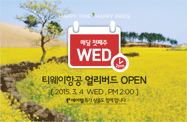 티웨이항공은 다가오는 따뜻한 봄과 가정의 달을 맞이하여 많은 여행객들에게 합리적인 여행길을 열어드리고자 "해피 프라이스, 해피 타임(Happy Price, Happy Time)" 초특가 얼리버드 및 에어텔 이벤트를 진행한다.