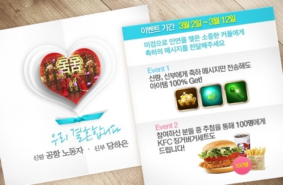 게임 내에서는 결혼 기념 이벤트를 진행한다. 신랑, 신부에게 축하 메시지를 전송하면 사례금, 어메이징 승급석, 대량 경험단을 지급하며 이벤트에 참여한 캐릭터 중 추첨을 통해 KFC 징거 버거 세트를 지급한다.