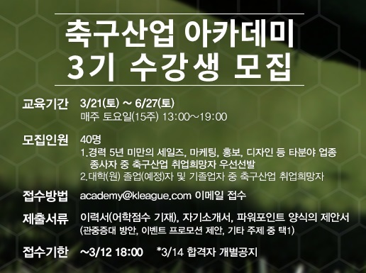 연맹은 3월 12일 오후 6시까지 축구산업아카데미 교육 3기생을 모집한다. 세일즈, 마케팅, 광고/홍보, 디자인 등 전문분야에 종사한 경력자를 우선 선발하며, 대학(원) 졸업자나 졸업예정자 중 축구산업 취업 희망자도 지원 가능하다.