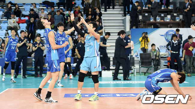 대전 삼성화재 블루팡스가 3일 인천 계양체육관에서 열린 2014-2015시즌 NH농협 V리그 남자부 6라운드 인천 대한항공 점보스와 경기서 세트 스코어 3-0(25-20, 28-26, 25-21) 완승을 거두고 정규리그 4연패의 위업을 달성했다.