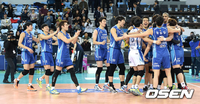 대전 삼성화재 블루팡스가 3일 인천 계양체육관에서 열린 2014-2015시즌 NH농협 V리그 남자부 6라운드 인천 대한항공 점보스와 경기서 세트 스코어 3-0(25-20, 28-26, 25-21) 완승을 거두고 정규리그 4연패의 위업을 달성했다.