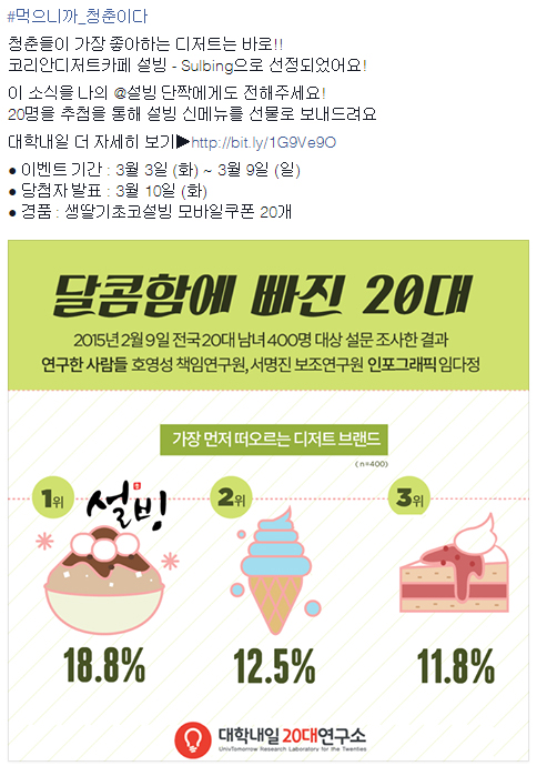 이벤트는 설빙 페이스북에 게재된 ‘#먹으니까_청춘이다’ 해당 게시글을 공유, 전달하는 방식으로 진행되며 오는 10일 추첨을 통해 ‘생딸기초코설빙’ 모바일쿠폰을 선물로 제공한다.