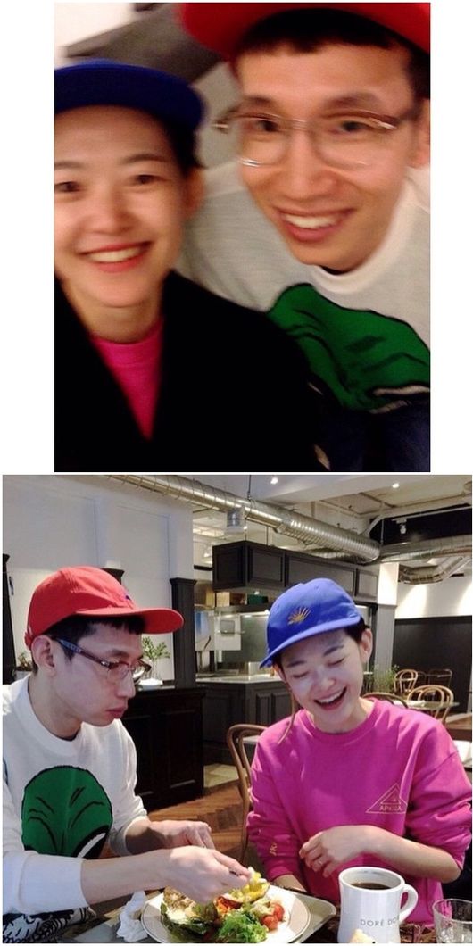 사진 속 두 사람은 색깔로 차이를 준 커플 캡모자를 쓰고 즐거운 시간을 보내고 있다. 식당에서 자연스러운 모습이나, 미소를 지으며 함께 카메라를 바라보는 모습이 다정한 연인의 분위기를 자아낸다.