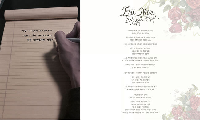 공개된 사진 속 ‘ 이젠 네 생각에 우는 일도 없어 잠에서 울다 깨는 일도 없어 정말 익숙해졌나 봐 괜찮아’라는 다소 투박하지만, 조심스레 써 내려간 에릭남의 손 글씨는 아날로그 감성을 자극한다.