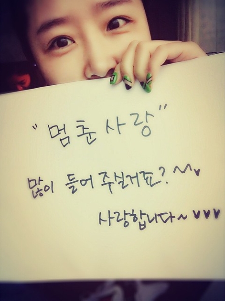 사진 속에는 신지가 "멈춘 사랑, 많이 들어주실꺼죠? 사랑합니다"라고 쓰여있는 피켓을 들고 있는 모습이다. 연예계 대표 동안 중 한명인 신지의 화장기 없는 수수한 민낯이 돋보인다.