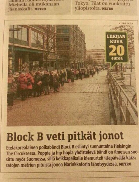 이어 핀란드 헬싱키 전역에 배포되는 신문 메트로에서는 ‘한국에서 온 보이그룹 블락비가 헬싱키에서 공연을 가졌으며 팝과 힙합을 접목한 음악을 하고 있다’, ‘공연을 한참 앞둔 이른 오전에도 200m 이상의 줄을 설만큼 많은 관객들이 찾고 있어 놀랍다’며 블락비의 공연 소식을 전했다.