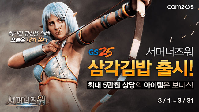 이달 31일까지 전국 GS25에서 판매되는 서머너즈 워 삼각김밥을 구매하고 쿠폰번호를 입력한 모든 유저에게 최대 5만 원 상당의 게임 아이템을 선물한다.