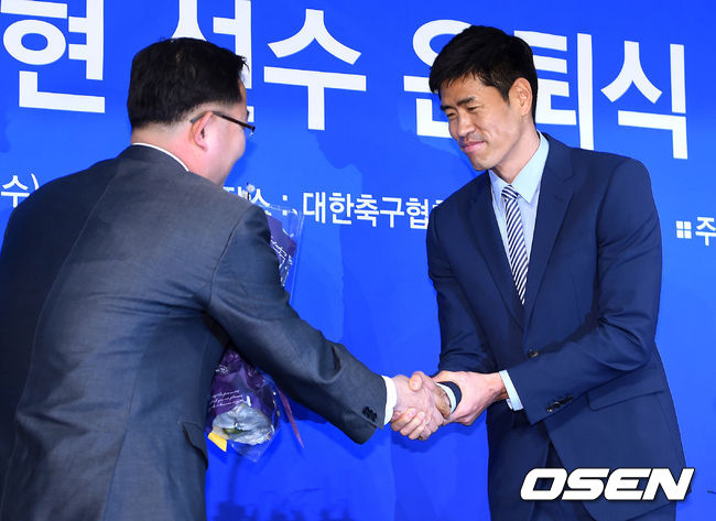 설기현이 4일 오전 서울 신문로 축구회관에서 열린 은퇴식 기자회견에서 인천 유나이티드 김학범 국장으로부터 꽃다발을 받고 있다.