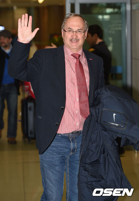 슈틸리케 감독이 입국장에 들어서고 있다.