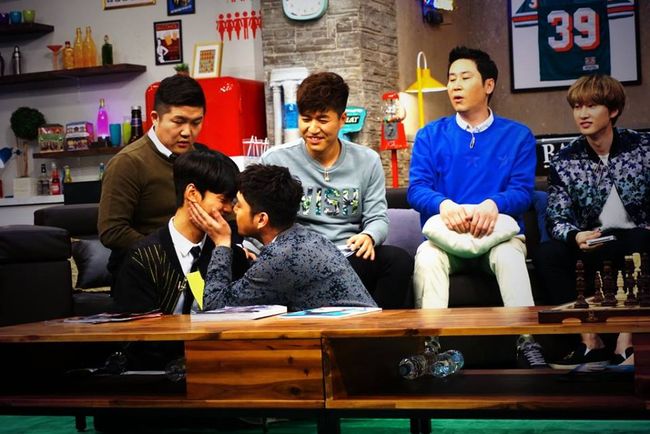 해당 사진 속 강인은 엔의 양뺨에 손을 얹고 눈을 감고 엔의 입술 앞에 다가서는 상황. 이를 신동엽, 은혁, 김종민, 조세호 등이 소파에 앉아 바라보고 있다.