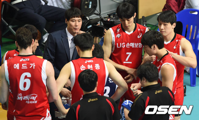 1세트 LIG 강성형 감독대행이 작전지시를 하고 있다.