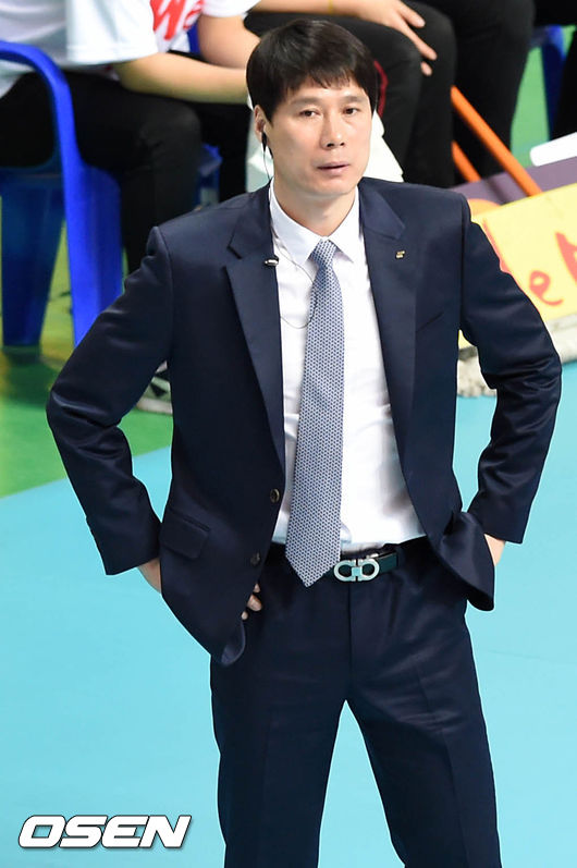 2세트 LIG 손해보험 강성형 감독대행이 경기를 지켜보고 있다.