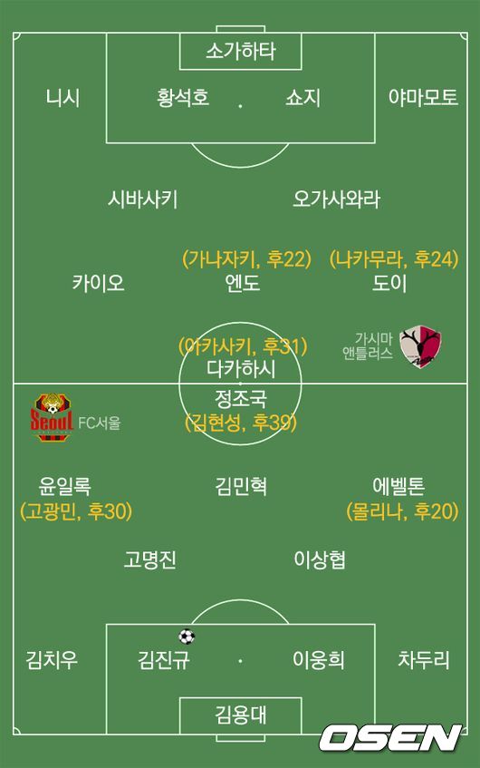 오른쪽 발목 부상을 당한 오스마르를 명단에서 제외한 서울은 최전방에 정조국, 2선에 윤일록-김민혁-에벨톤을 가동했다. 중원에는 고명진과 이상협이, 포백에는 김치우-김진규-이웅희-차두리가 섰다. 골키퍼 장갑은 김용대가 꼈다. 상대 가시마는 황석호를 선발로 내세웠다.