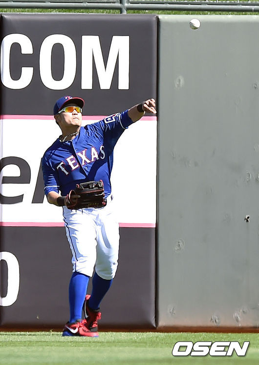 2회초 텍사스 추신수가 캔자스시티 다이슨의 타구를 처리하고 있다.