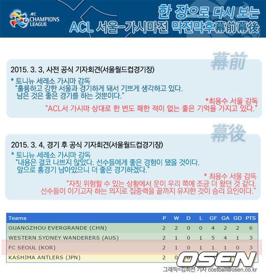 H조는 최 감독 스스로도 인정할 만한 죽음의 조다. 하지만 1차전서 강력한 우승후보 광저우에 패한 서울은 이날 승리로 2위 웨스턴 시드니(호주)와 승점은 같고 골득실에서 뒤진 3위를 유지했다. 이날 경기서 패해 2패가 되었다면 남은 조별리그를 헤쳐가기는 더욱 어려울 수밖에 없는 상황이었으나, 광저우와 가시마를 만나 1승 1패를 기록한 서울은 ACL 조별리그 남은 일정을 어떻게 소화하느냐에 따라 16강 진출의 당락이 갈리게 됐다.