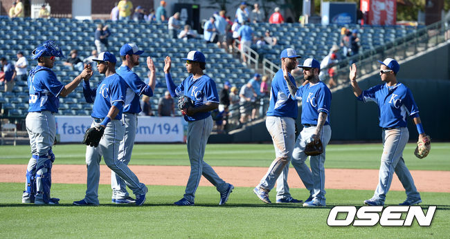 승리를 거둔 캔자스시티 선수들이 하이파이브를 하고 있다.