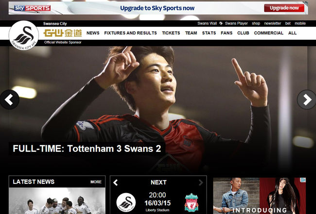 시즌 6호골을 터트린 기성용(26, 스완지 시티)이 스완지 시티 홈페이지 메인을 장식했다.