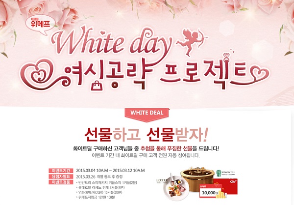 작년 같은 기간에 사탕, 초콜릿이 가장 많이 판매된 것과 달리 올해에는 화장품, 향수, 지갑, 액세서리 등이 인기를 얻으면서 ‘화이트데이는 사탕’ 공식이 깨졌음을 보여줬다. 또한 2030 여성의 화이트데이 상품 구매액이 2030 남성보다 약 2배 가량 높은 것으로 나타나 요즘에는 화이트데이에 연인들이 서로 선물을 주고 받는 추세임을 나타냈다.