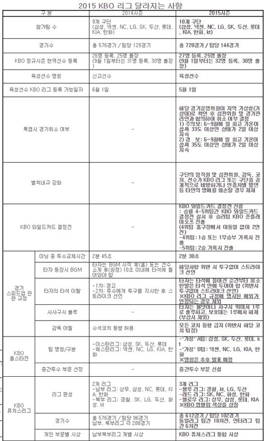 2015 타이어뱅크 KBO 리그로 출발하는 올 시즌은 KBO 정규시즌 개막(28일)에 앞서 7일부터 시범경기로 대장정의 서막을 연다. 올해는 경기 스피드업 강화, 올스타전 중간 투수 부문과 포스트시즌 와일드카드 결정전 신설 등 리그 확대에 맞춰 달라진 부분도 다양하다. 시범경기부터 적용될 2015 KBO 리그의 달라지는 사항을 정리해봤다.