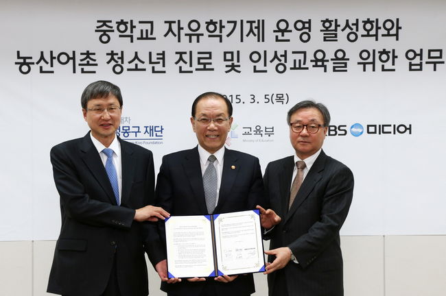 이를 위해 정몽구 재단은 교육부, KBS미디어와 함께 5일 재단 대회의실(종로구 소재)에서 황우여 사회부총리 겸 교육부장관, 유영학 재단 이사장, 박영문 KBS미디어 사장 등이 참석한 가운데 ‘중학교 자유학기제 활성화 및 농산어촌 청소년 진로 및 인성 교육’과 관련한 업무협약을 체결했다.
