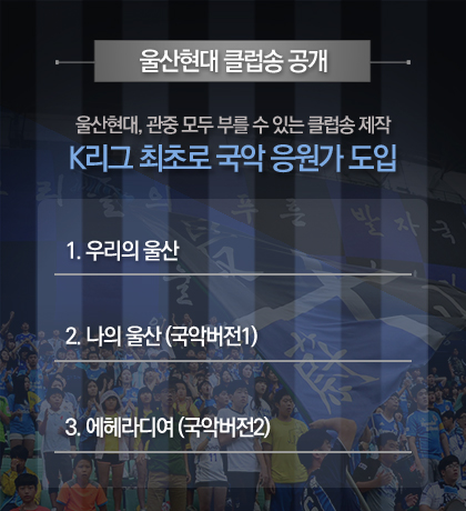 울산은 5일 오전 구단 공식 홈페이지 및 SNS를 통해 총 3곡의 클럽송을 발표했다. 그 중 2곡은 국립 국악원에서 울산에 헌정한 ‘국악 응원가’이며 K리그 최초 ‘국악 응원가’로도 큰 관심을 받아왔다.