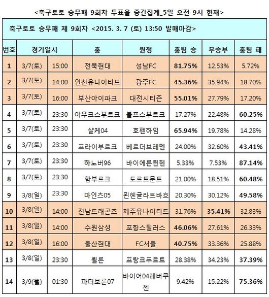 [축구토토] 국민체육진흥공단(www.kspo.or.kr)이 발행하는 체육진흥투표권 공식 인터넷 발매사이트 베트맨(www.betman.co.kr)은 오는 7일부터 9일까지 벌어지는 K리그 클래식 6경기 및 독일 분데스리가 8경기 등 총 14경기를 대상으로 한 축구토토 승무패 9회차 투표율 중간집계 결과, K리그 클래식 개막전 전북-성남(1경기)전에서 국내 축구팬 81.75%가 전북의 압승을 점쳤다고 밝혔다.