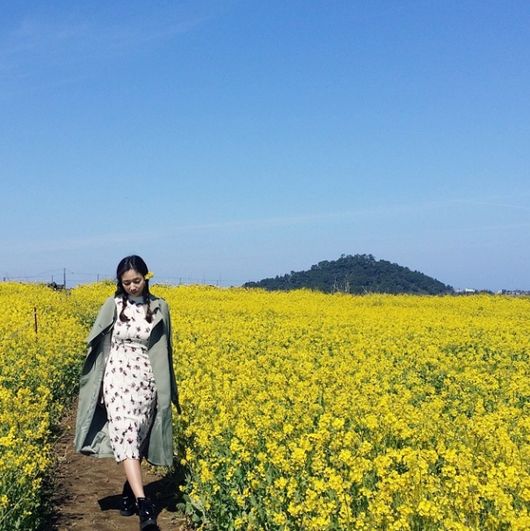 사진 속 진재영은 제주도 유채꽃밭에서 머리에 유채꽃을 꽂은 채 길을 걷고 있다. 멀리서도 확인할 수 있는 예쁜 외모와 완벽한 몸매가 보는 이들의 시선을 사로잡는다.