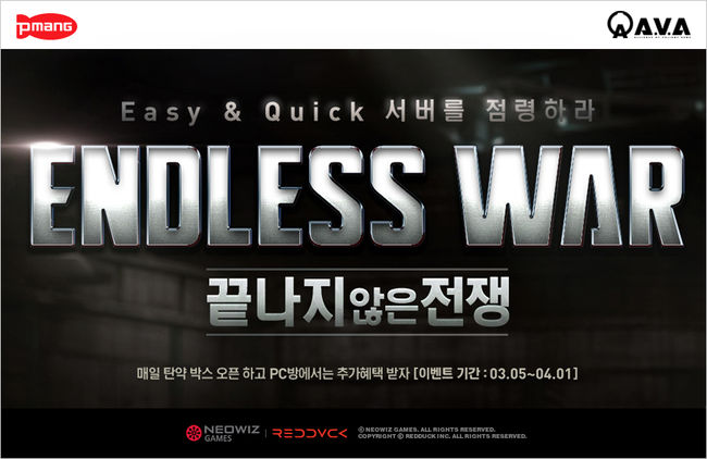 네오위즈게임즈가 레드덕이 개발한 밀리터리 FPS(1인칭 슈팅)게임 ‘아바(A.V.A)’에서 신학기를 맞아 아이템을 지급하는 ‘끝나지 않은 전쟁’ 이벤트를 진행한다고 5일 밝혔다.