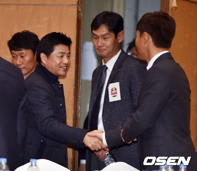 5일 오후 서울 서대문구 홍은동 그랜드 힐튼호텔 서울 그랜드볼룸에서 현대오일뱅크 K리그 클래식 2015 개막 미디어데이가 열렸다. 부산 윤성효 감독이 광주 남기일 감독과 악수를 나누고 있다.