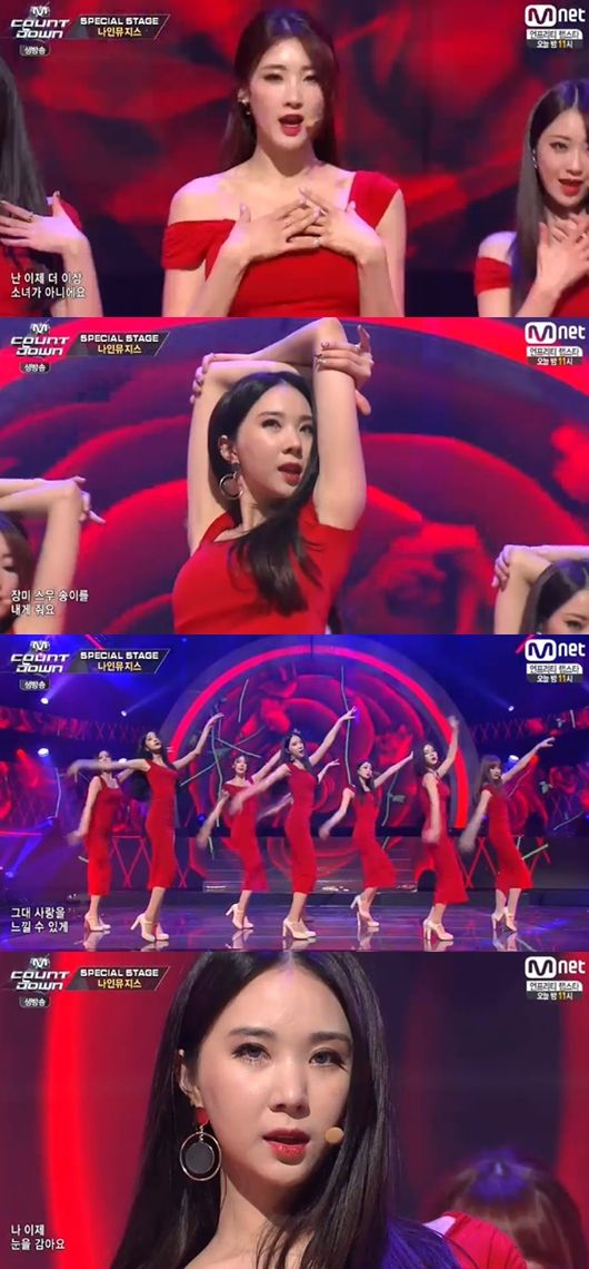 이날 나인뮤지스는 박지윤의 ‘성인식’ 무대를 꾸몄다. 옆트임이 있는 레드 드레스를 입은 나인뮤지스는 섹시한 매력을 유감없이 발휘했다.