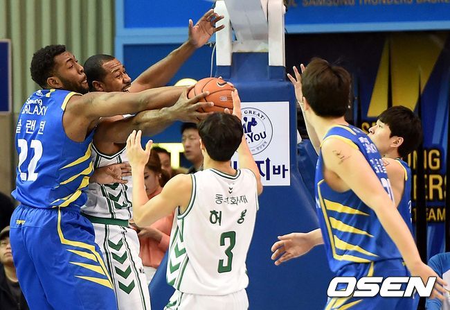 1쿼터, 삼성 클랜턴과 동부 사이먼을 비롯한 양 팀 선수들이 리바운드 다툼을 벌이고 있다.
