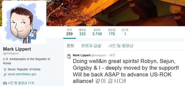 리퍼트는 5일 오후 자신의 트위터에서 “좋은 상태다. 로빈(아내)과 세준(아들), 그릭스비(애완견)와 함께 잘 있다”며 “지지에 매우 감동받았다. 한미동맹 진보를 위해 빠른 시일 안에 돌아오겠다”고 했다.