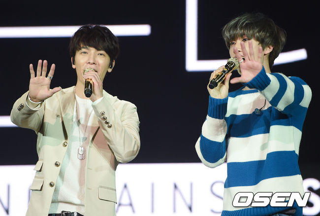 5일 오후 서울 삼성동 SM타운 코엑스 아티움에서 진행된 슈퍼주니어-D&E 국내 첫 앨범 '더 베스트 고우즈 온(The Beat Goes On)' 기념 쇼케이스, 슈퍼주니어 동해와 은혁이 인사를 하고 있다.