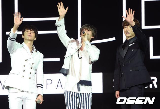5일 오후 서울 삼성동 SM타운 코엑스 아티움에서 진행된 슈퍼주니어-D&E 국내 첫 앨범 '더 베스트 고우즈 온(The Beat Goes On)' 기념 쇼케이스, 슈퍼주니어 동해와 은혁, 사회를 맡은 이특이 팬들에게 인사를 하고 있다.