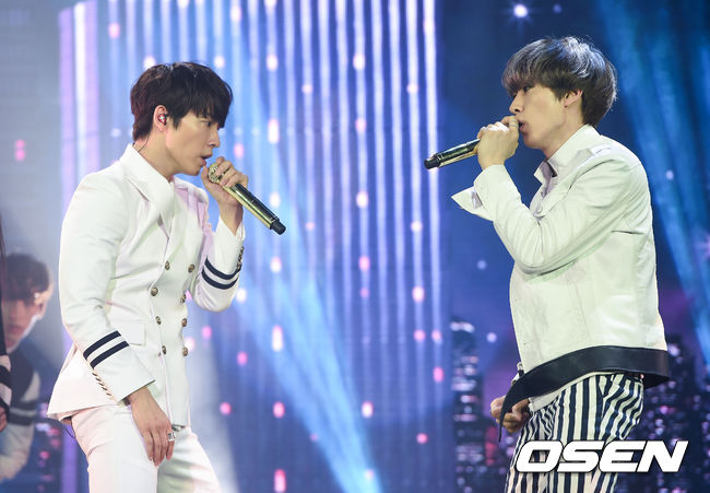5일 오후 서울 삼성동 SM타운 코엑스 아티움에서 진행된 슈퍼주니어-D&E 국내 첫 앨범 '더 베스트 고우즈 온(The Beat Goes On)' 기념 쇼케이스, 슈퍼주니어 동해와 은혁이 멋진 무대를 펼치고 있다.