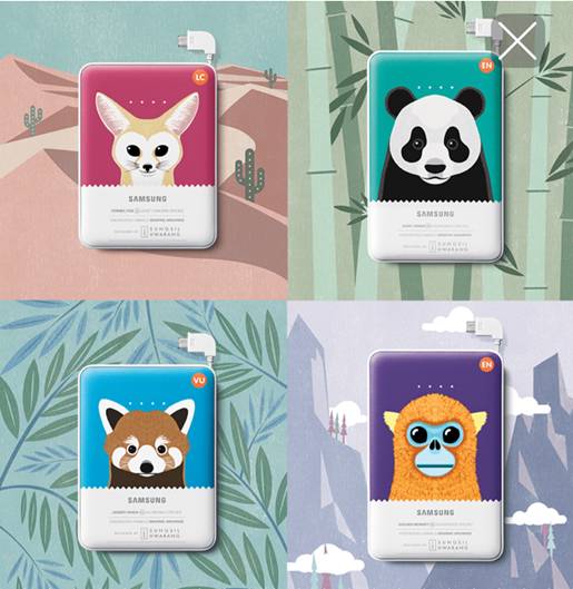 삼성전자는 충전용 보조배터리 '배터리 프렌즈'를 선보이고 있다. 보통 보조배터리가 검정, 흰색 등으로 무늬 없이 깔끔한 것에 비해 이 제품에는 4가지 종류의 동물이 그려져 있다. 자이언트 팬더, 황금들창코 원숭이, 랫서팬더, 사막여우 등이다. 이 동물들은 모두 멸종위기에 처한 동물들로, 절박함을 알리기 위해 표정 없이 정면을 응시하는 모습으로 디자인됐다.