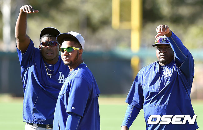 유리베와 푸이그가 반대편 훈련장에서 훈련중인 류현진을 부르고 있다.