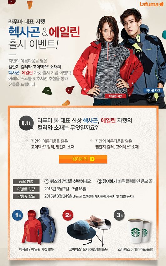 LF(대표 구본걸, www.lfcorp.com)가 전개하는 프랑스 정통 아웃도어 브랜드 라푸마(Lafuma)에서 2015 S/S 주력 아이템인 '헥사곤 & 에일린 고어텍스 자켓' 출시를 기념한 이벤트를 진행한다.
