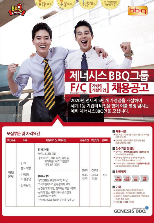 이번 채용을 총괄한 인사전략실의 김진헌 실장은 "제너시스비비큐 그룹은 프랜차이즈 업계 최고 대우를 보장하는 FC 전문인력을 100여명 채용하기로 결정했다"며"프랜차이즈 영업전문가로의 성장을 원하는 역량 있는 지원자들의 많은 지원 바란다"고 밝혔다.